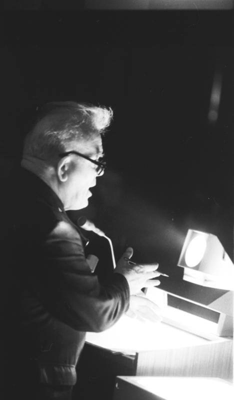14.01.1982 г. Директор ЛВТА член-корр. М.Г. Мещеряков выступает на заседании Ученого совета ОИЯИ. Автор снимкa Юрий Туманов.