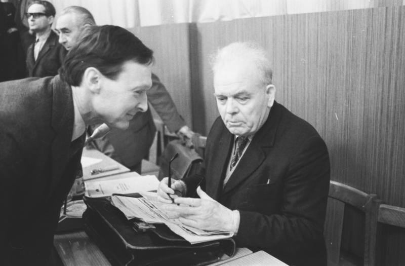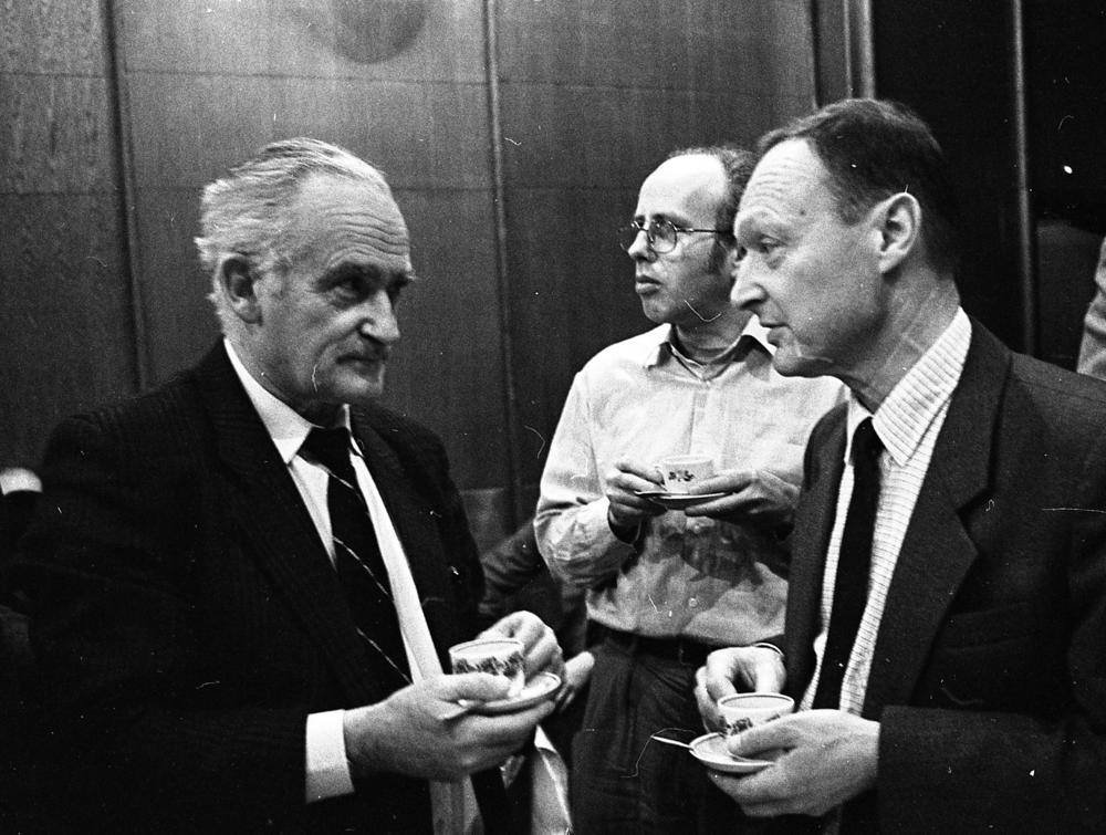 14.01.1982 г. В перерыве между заседаниями Ученого совета ОИЯИ. Слева направо: проф. Г. Позе (ГДР) и директор ЛВТА член-корр. АН СССР М.Г. Мещеряков. Автор снимкa Юрий Туманов.