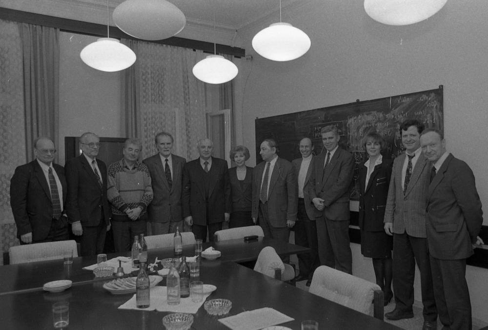 30.01.1996 г. На встрече с Михаилом Горбачевым в дирекции ОИЯИ. Слева направо: И.А. Савин, Д.В. Ширков, Ю.Ц. Оганесян, В.Г. Кадышевский, М.С. Горбачев, Р.М. Горбачева, А.Н. Сисакян, В.Л. Аксенов, А.И. Лебедев, Н.П. Боголюбова, Н.А. Русакович, Р. Позе. Автор снимкa Юрий Туманов.