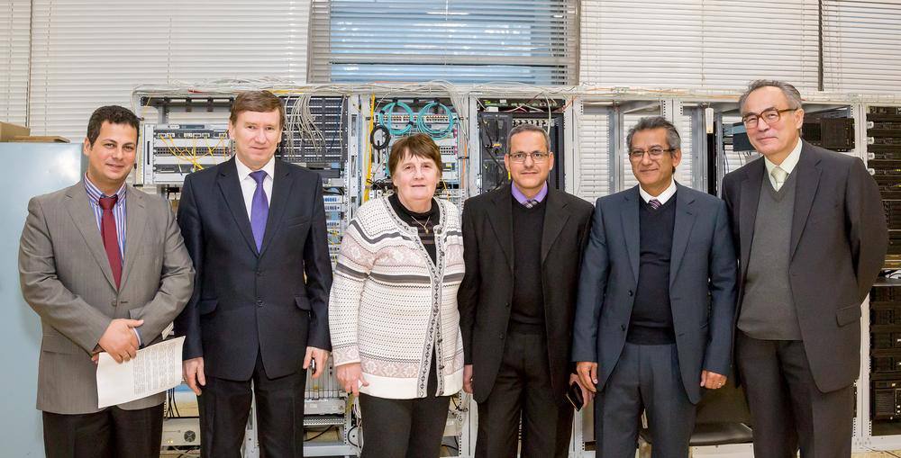 12.01.2015 г. Представители Египта на экскурсии в ЛИТ. Слева направо: В. Бадави, В.В. Кореньков, Т.А. Стриж, Атеф А. Абдель-Фаттах (Египет), Сэми Ш. Солиман (Египет), Г. Адам. Фото ОИЯИ.
