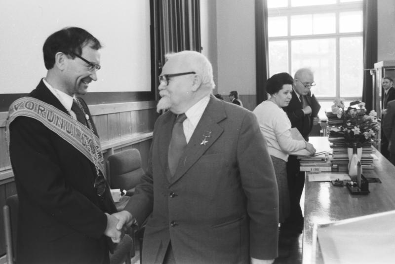 18 марта 1980 г. Академик А. Н. Тихонов (справа) поздравляет Н. Н. Говоруна. Автор снимкa Юрий Туманов.