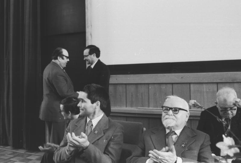 18 марта 1980 г. Слева направо: Н. Н. Говорун принимает поздравления от В. А. Мещерякова, рядом — Г. И. Крутенко, А. Н. Тихонов, М. Г. Мещеряков. Автор снимкa Юрий Туманов.