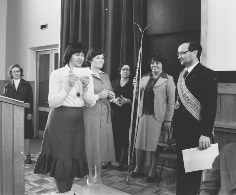 18 марта 1980 г. Н. Н. Говоруна поздравляют с юбилеем сотрудницы ЛВТА . Слева направо: Г. Н. Тентюкова, И. Н. Кухтина, Л. А. Смирнова, Р. Н. Федорова, Л. А. Кулюкина, Н. Н. Говорун. Лучший подарок юбиляру — лыжи. Автор снимкa Юрий Туманов.