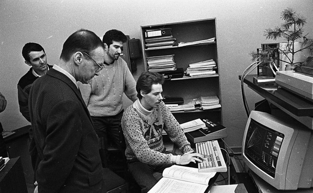 17 марта 1993 г. Директор ЛВТА проф. Р. Позе знакомится с организацией работ на комплексе СИНС по моделированию и обработке данных экспериментов ФОБОС (ЛЯР) и DISTO (ОИЯИ-Турин-Сакле-Индиана). Слева направо: Р. Позе, И. В. Амирханов, Ю. С. Смирнов, сидит Д. В. Вакатов. Автор снимкa Юрий Туманов.