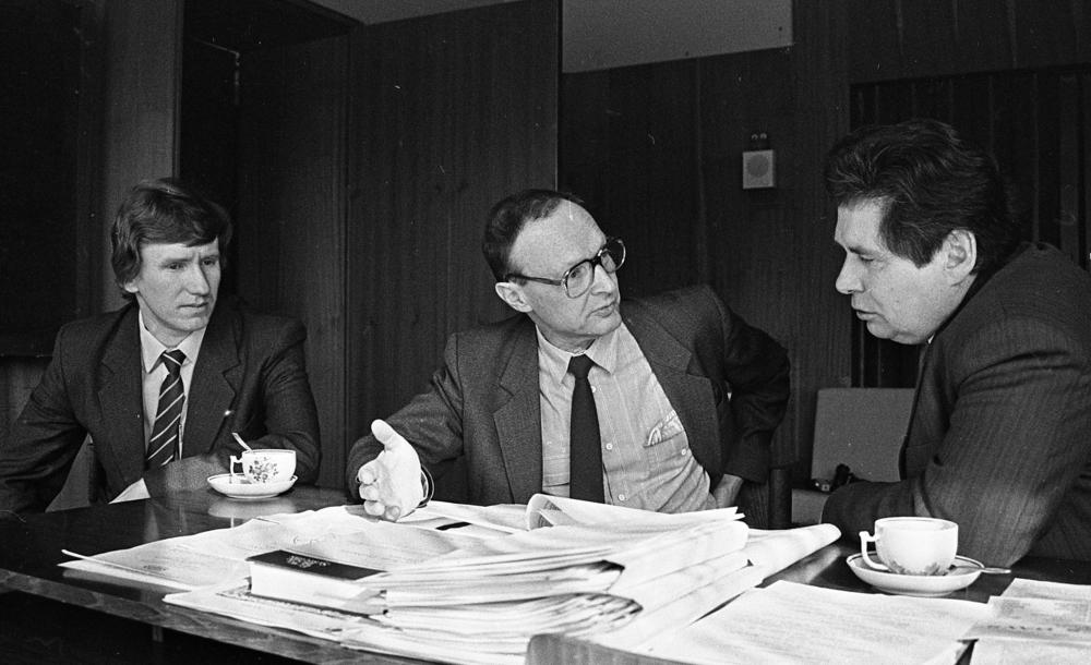 17 марта 1993 г. Дирекция ЛВТА (слева направо): зам. директора В. В. Кореньков, директор Р. Позе, зам. директора И. В. Пузынин. Автор снимкa Юрий Туманов.