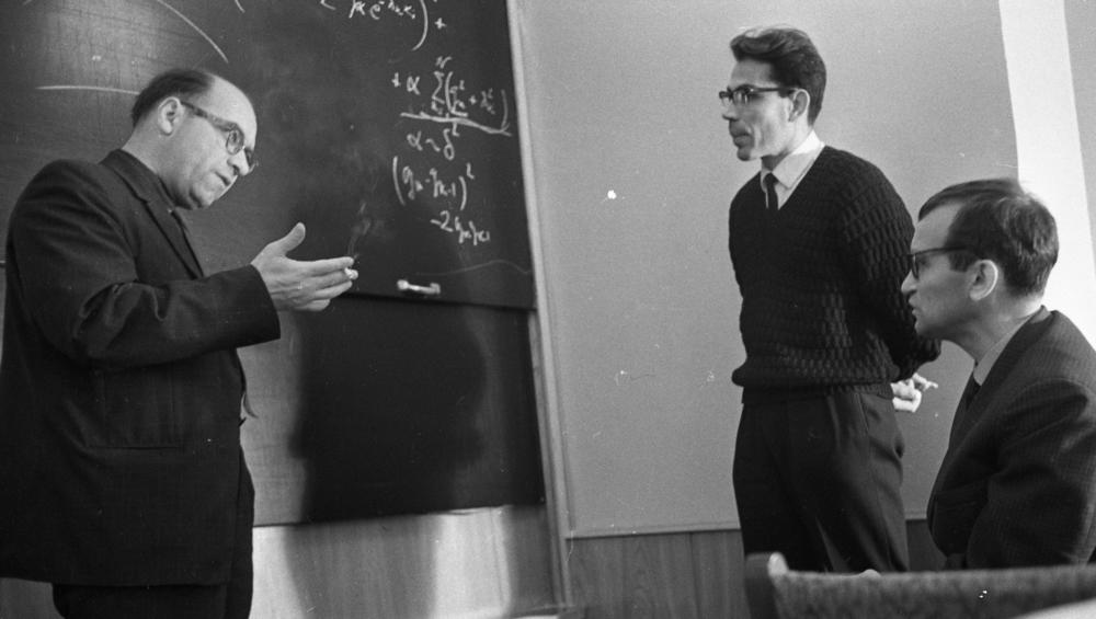 10.10.1966 г. Слева направо: во время обсуждения результатов работы Е.П. Жидков, Н.Н. Говорун и Р. Денчев. Автор снимка — Павел Зольников.