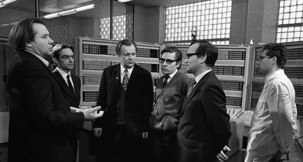 06.10.1975 г. Слева направо: В.В. Федорин, И.Н. Силин, С.А. Щелев, В.П. Шириков, Н.Н. Говорун, И.А. Емелин у пульта управления ЭВМ БЭСМ-6 в ЛВТА.