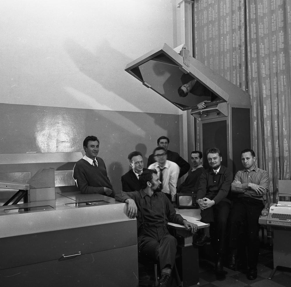 18.10.1971 г. В ОИЯИ совместно с институтами стран-участниц создана высокопроизводительная сканирующая система "Спиральный измеритель" предназначенная для обработки снимков с трековых камер. На снимке: разработчики этой системы А.Е. Селиванов, В.Н. Лысяков, Р.Г. Позе, В.М. Котов, А.Ф. Петрусевич, А.И. Радионов, И.И. Скрыль. Автор снимка — Юрий Туманов.