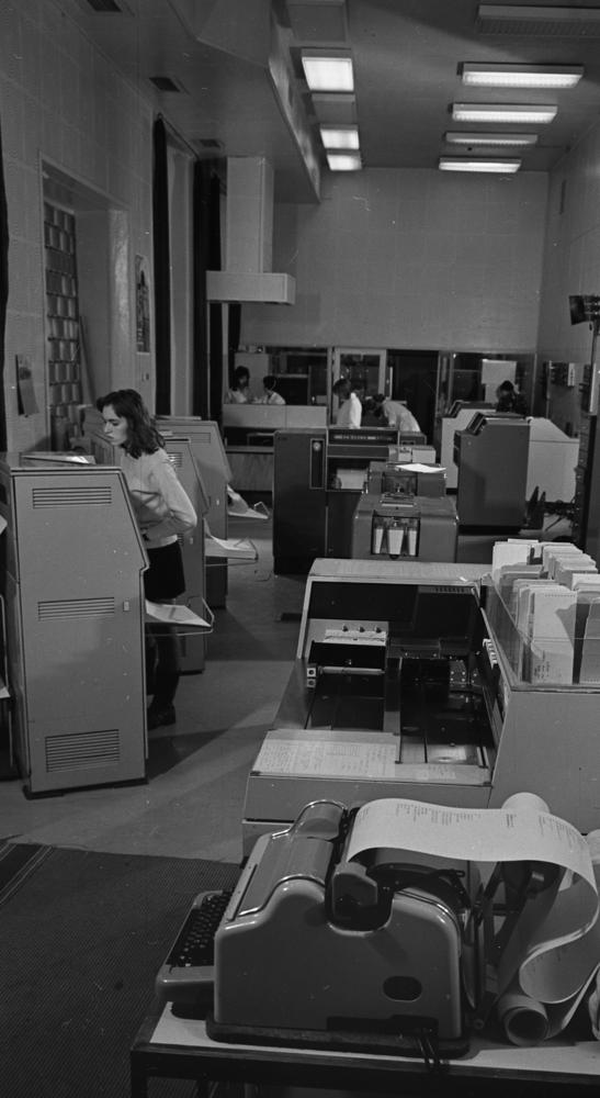 06.10.1975 г. Зал устройств ввода-вывода CDC-6200 и БЭСМ-6. Л.А. Карташова возле устройства широкой печати. Автор снимка — Юрий Туманов.