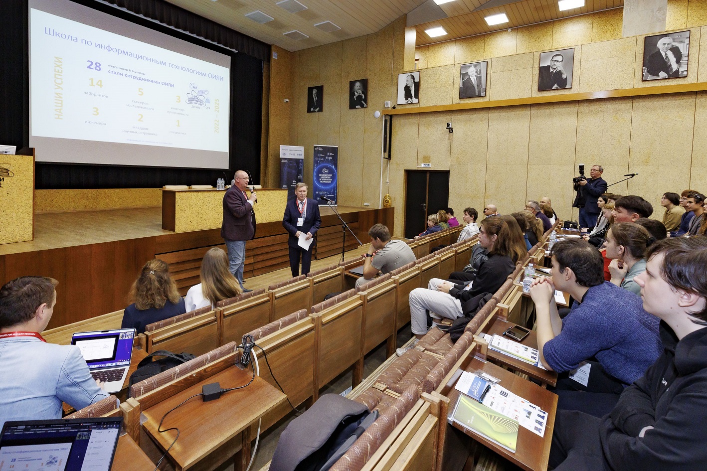 В первый день ребята смогли послушать лекцию академика Юрия Оганесяна - живой легенды мировой ядерной физики, внёсшего решающий вклад в синтез новых сверхтяжёлых элементов. В числе приглашенных лекторов на ИТ-школе ОИЯИ также выступил Василий Велихов, помощник президента НИЦ «Курчатовский институт», с лекцией о развитии национальной сети компьютерных телекоммуникаций для науки и высшей школы России. Профессор СПбГУ Надежда Щеголева рассказала о развитии технологий штрихового кодирования. Прозвучал доклад завкафедрой системного программирования ЮУрГУ Леонида Соколинского, посвященный линейному программированию в эпоху экзафлопсных компьютеров и искусственного интеллекта. От ОИЯИ на пленарной сессии также выступил директор ЛИТ Сергей Шматов, рассказавший о компьютинге для физики высоких энергий и применении информационных технологий для научных экспериментов. В своем докладе он продемонстрировал, как на основе анализа экспериментальных данных делаются открытия уровня Нобелевской премии. Информацию о научно-образовательной деятельности филиала МГУ в Дубне представил заместитель директора филиала Александр Ольшевский. Об образовательных активностях Института рассказал директор Учебно-научного центра ОИЯИ Дмитрий Каманин.