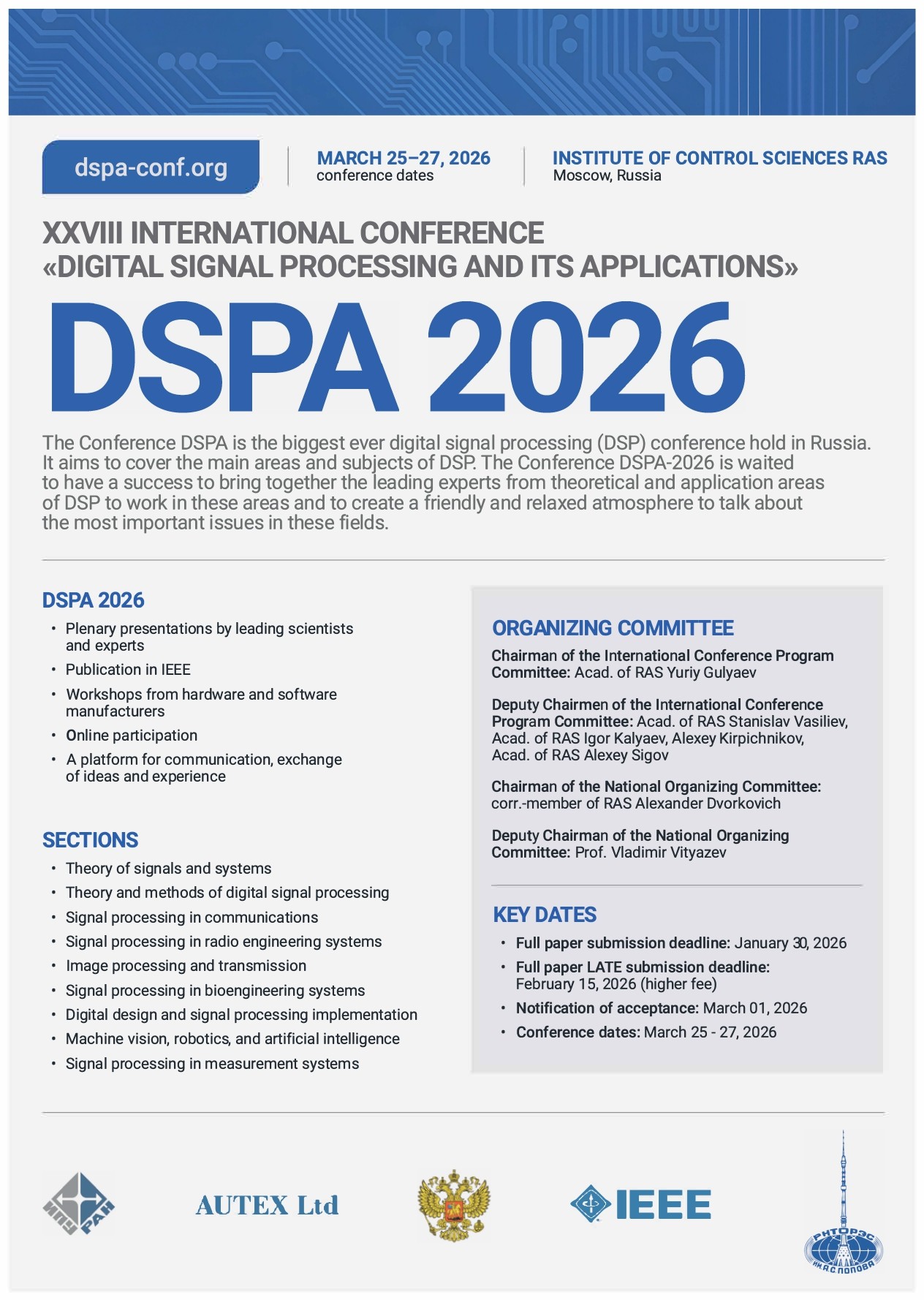 We invite you to take part in the XXVIII International Conference "Digital Signal Processing and Its Applications — DSPA-2026". The conference will be held during 25-27 March 2026 at the V. A. Trapeznikov Institute of Control Sciences of RAS.