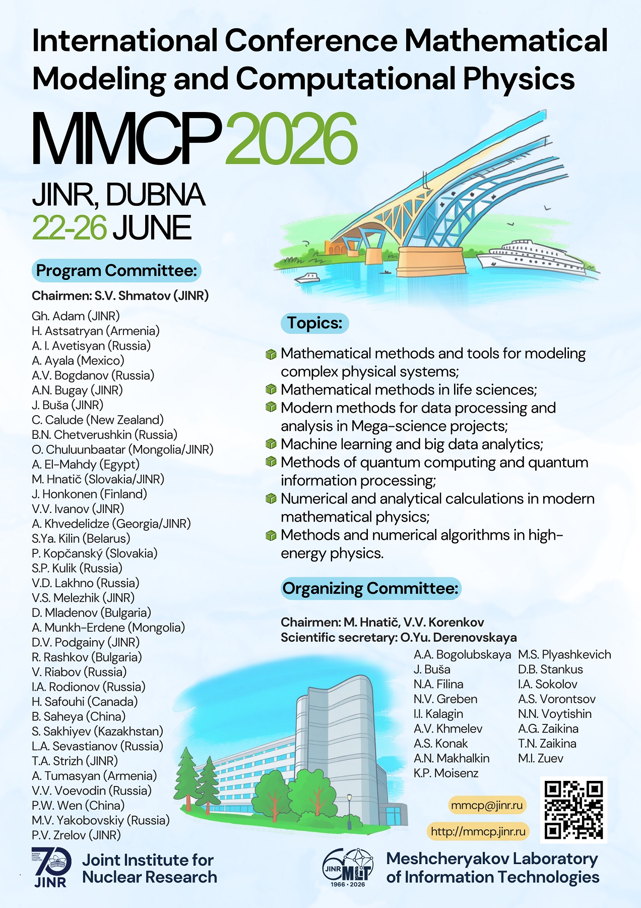 Лаборатория информационных технологий им. М. Г. Мещерякова ОИЯИ приглашает принять участие в международной конференции «Математическое моделирование и вычислительная физика» (MMCP’2026). Конференция пройдет с 22 по 26 июня 2026 года в ЛИТ ОИЯИ.