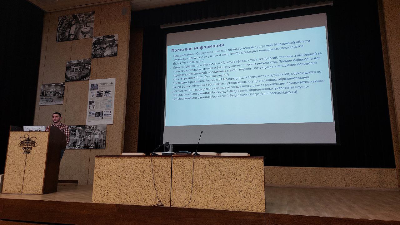С докладом выступил представитель ЛИТ в Совете Объединения молодых ученых и специалистов (ОМУС) ОИЯИ Иван Соколов. Он подробно ознакомил собравшихся с деятельностью ОМУС, его целями и задачами в рамках Института. Иван Соколов рассказал о том, как проводятся крупные международные конференции Объединения - AYSS, Алушта, а также научная школа «Липня» и Школа ускорительной физики. Также ОМУС на постоянной основе организует семинары и мастер-классы для профессионального роста. Кроме этого, Иван Соколов рассказал об участии молодых ученых ОИЯИ в мероприятиях, направленных на популяризацию науки: Летняя школа (мастерская ОИЯИ «105 элемент»), научные фестивали «NAUKA 0+» и «Дни физики в Дубне».